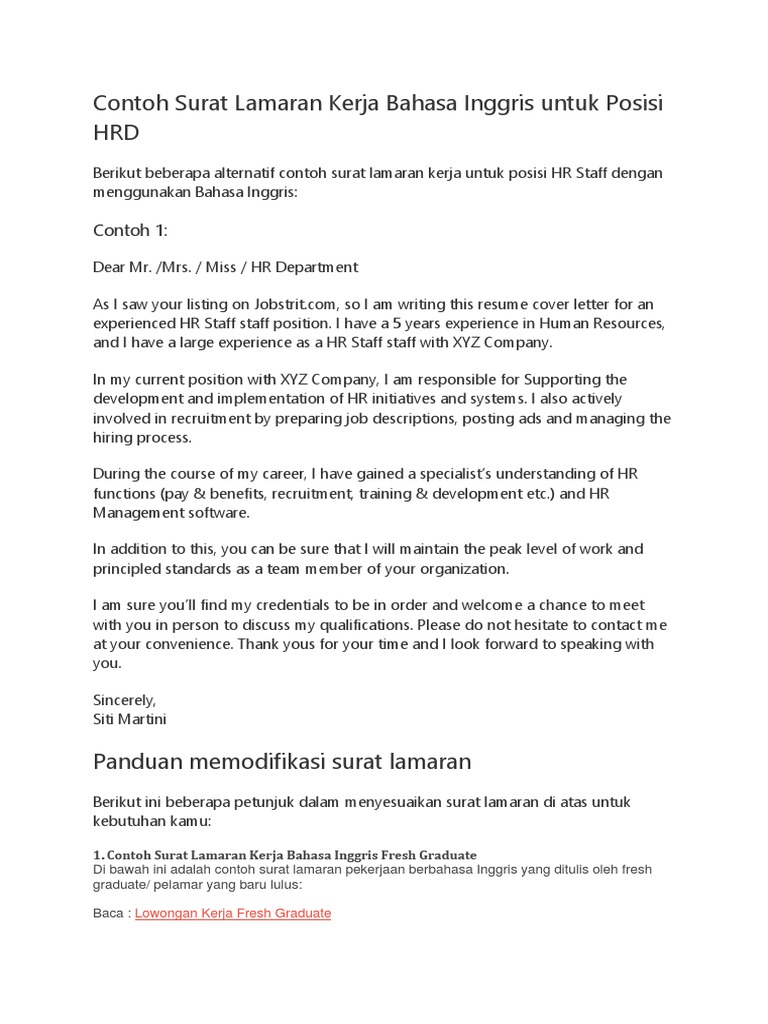 I can plan and develop various ways to attract new business. Berbeda dengan format contoh surat lamaran kerja bahasa inggris lainnya, format ini mempunyai isi jauh lebih. Contoh surat lamaran kerja dalam bahasa inggris dan artinya. I was graduated from manajemen bisnis of universitas teknologi yogyakarta, majoring in marketing management in december 2003, and have been working for mandiri corp retails in sales and marketing department. Seperti teks bahasa inggris lainnya, lamaran kerja yang ditulis dalam bahasa inggris tetap menggunakan bahasa yang sederhana dan right periksa kembali surat lamaran kerja berbahasa inggris sebelum dikirimkan.